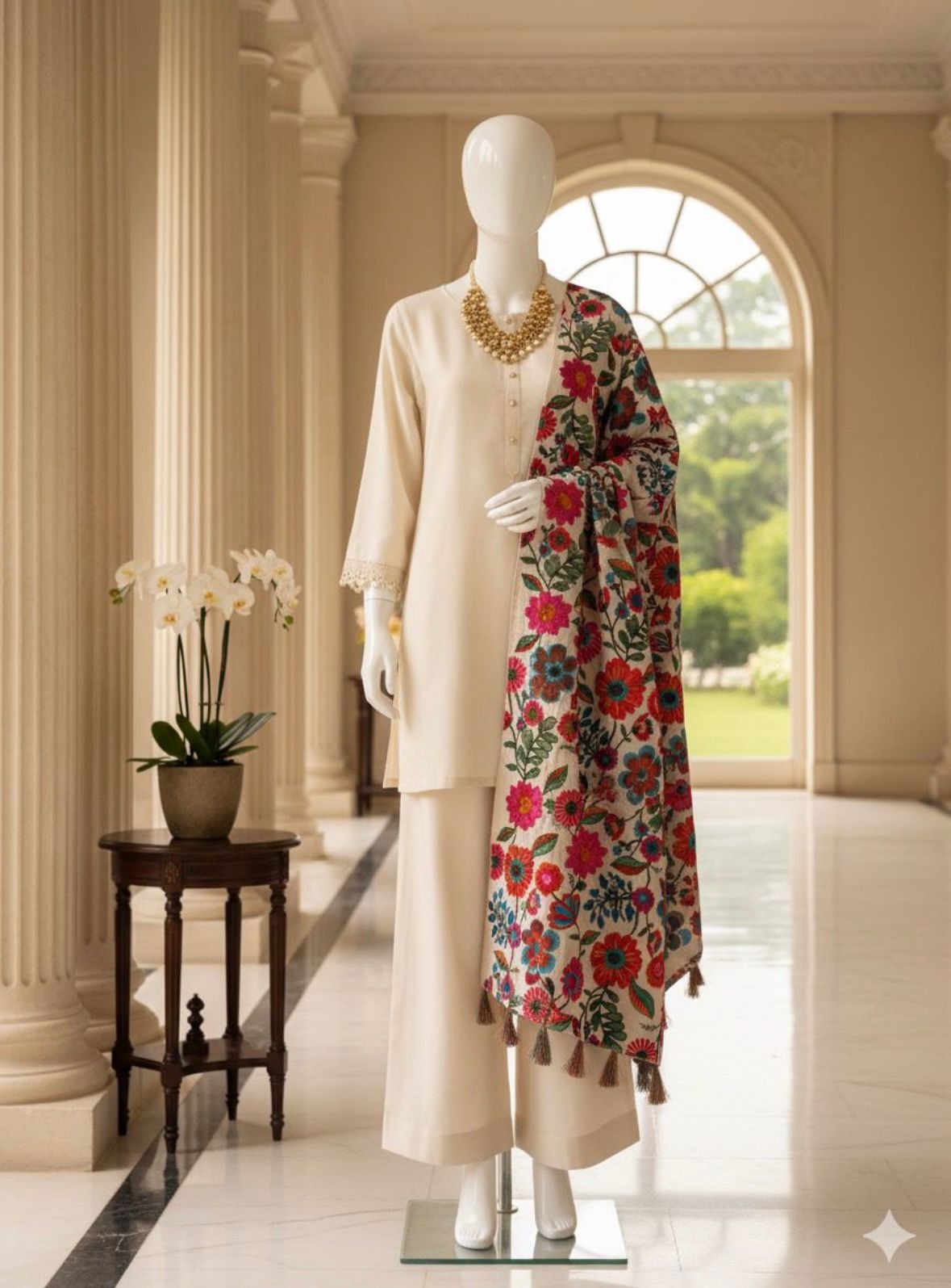 Experience timeless elegance with our Kadar Fabric Winter Shawl, crafted to bring warmth, luxury, and vibrant artistry together. This exquisite shawl features multicolor Kashmiri-inspired floral embroidery on a soft cream base, beautifully finished with handmade tassels at the edges. The richly embroidered surface showcases intricate threadwork in shades of pink, blue, orange, and green, creating a striking contrast that makes it perfect for winter festivities or casual elegance.